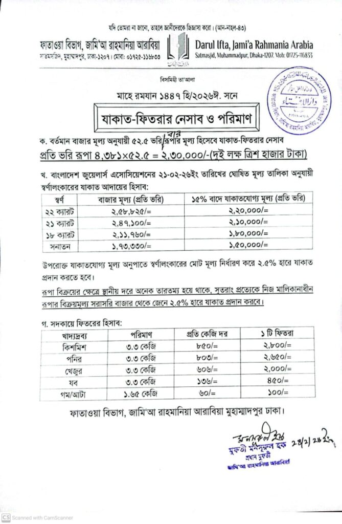 ক. বর্তমান বাজার মূল্য অনুযায়ী ৫২.৫ তোলা রৌপ্যের মূল্য হিসেব যাকাত-ফিতরার নেসাব